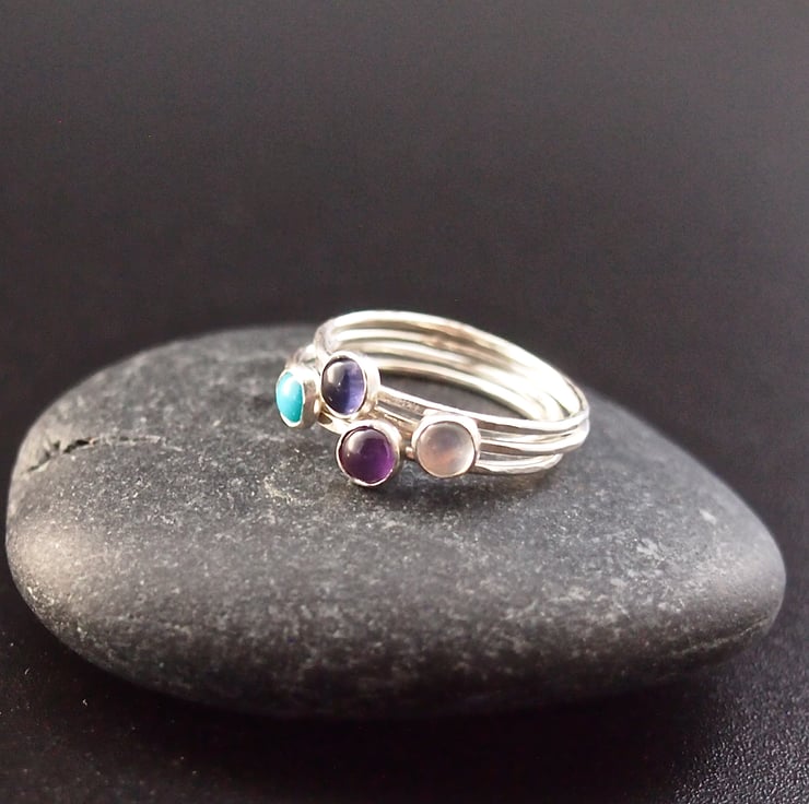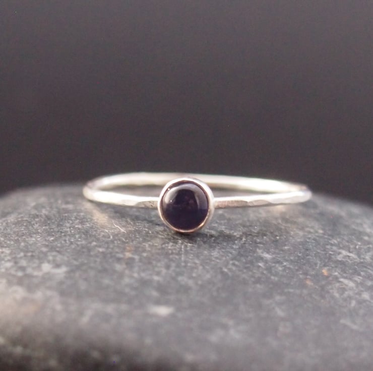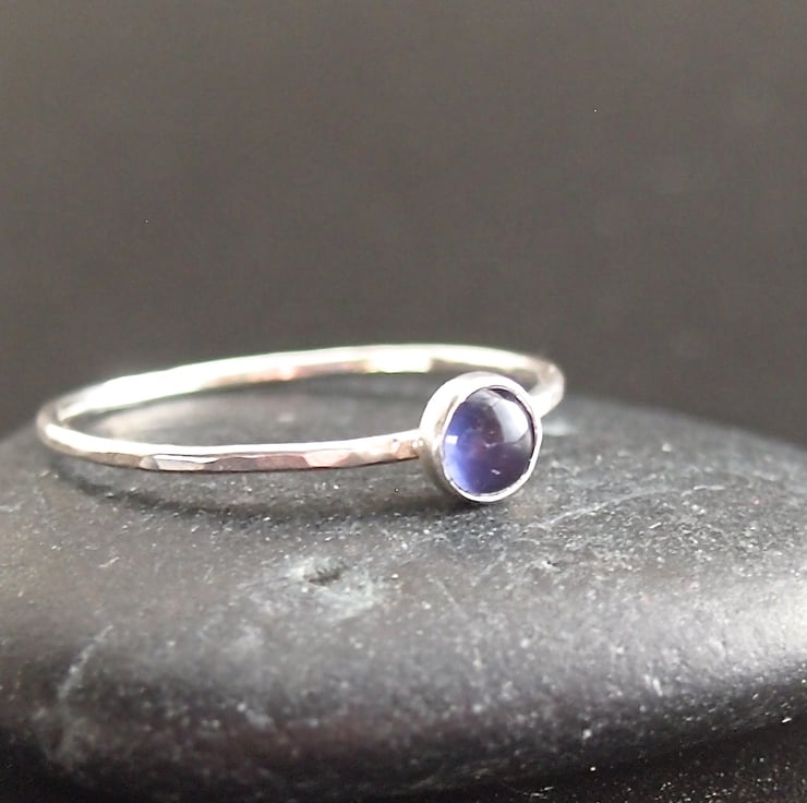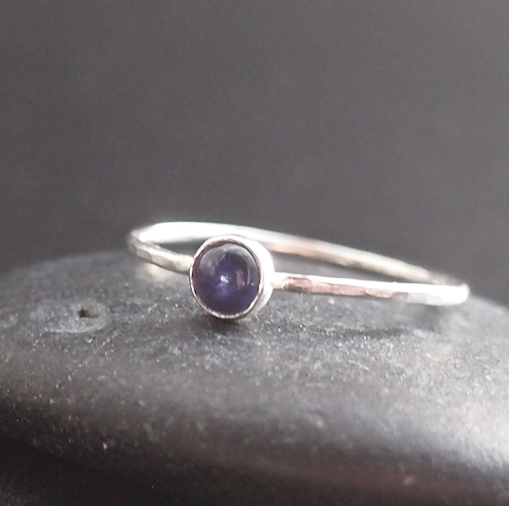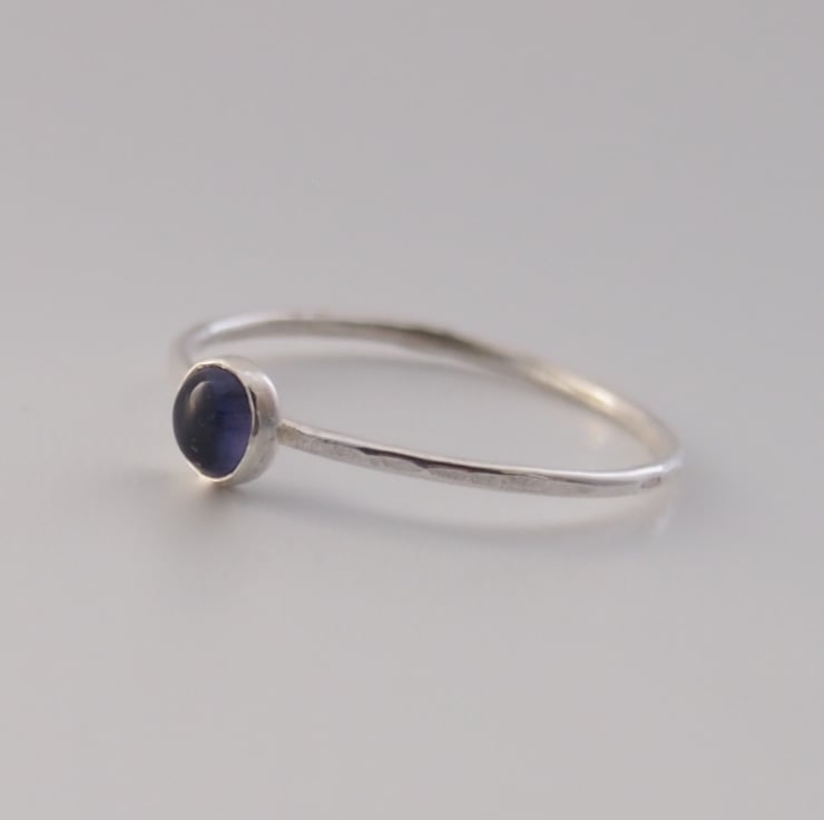 A 4mm iolite cabochon is set onto a skinny band which has been gently hammered for texture. An inky purple blue.