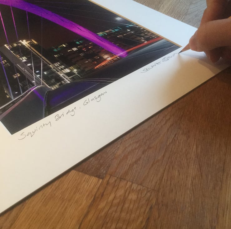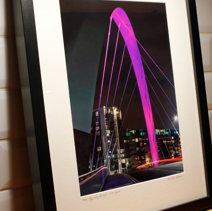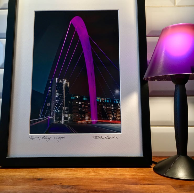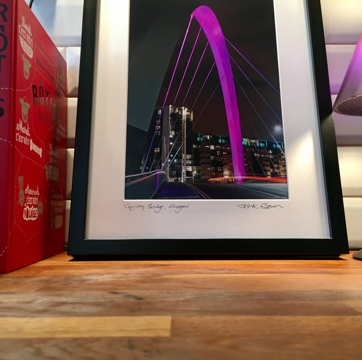 An original hand-signed mounted and framed photographic print of the iconic Squinty Bridge in Glasgow