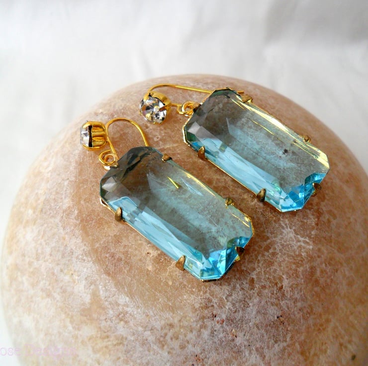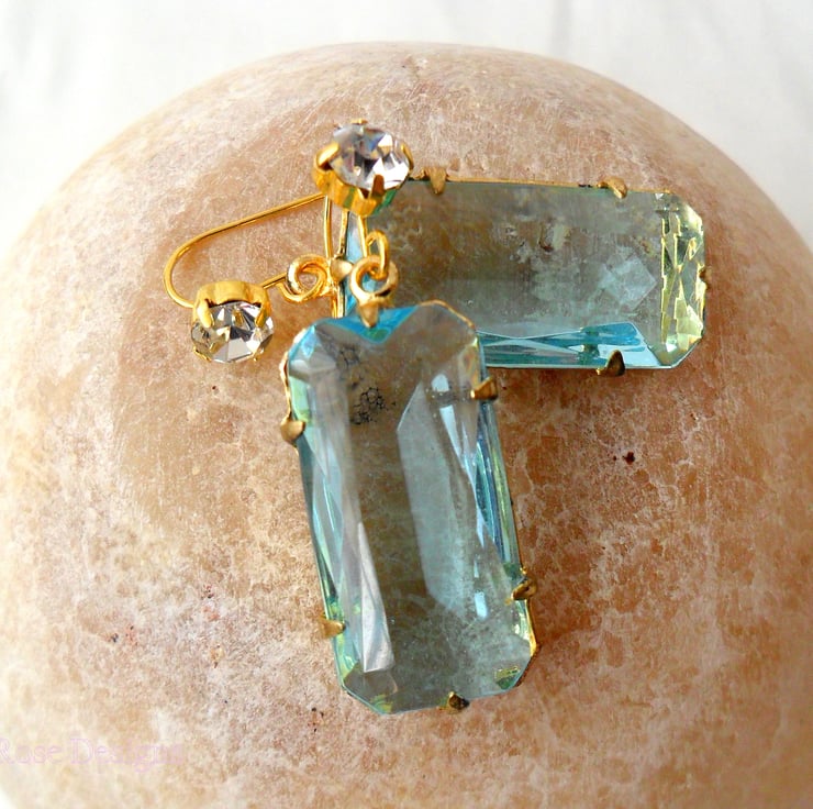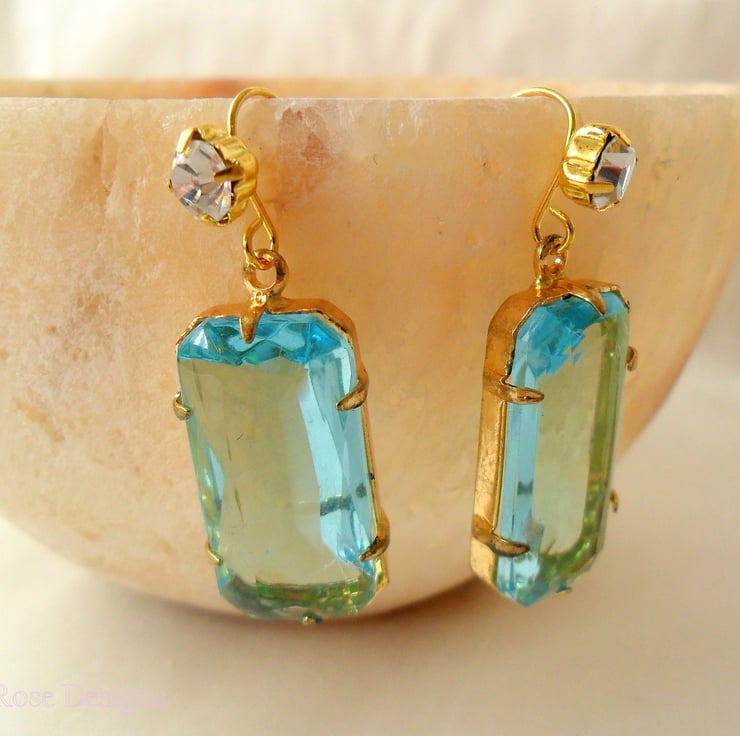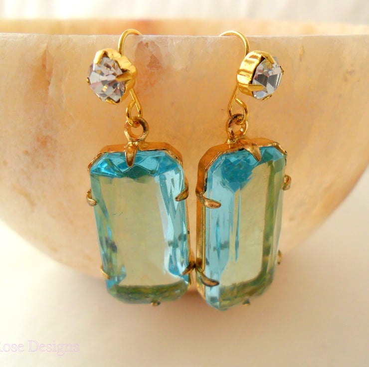 These lovely aqua and gold earrings have been handmade using gold plated diamante fish hook ear wires with a vintage aqua glass pendant. They have a drop of 1 1/2" long (4 cm) with the vintage glass pendants measuring 1" x 1/2" x 1/4" (2.7 cm x 1.3 cm x 6. 5 mm).