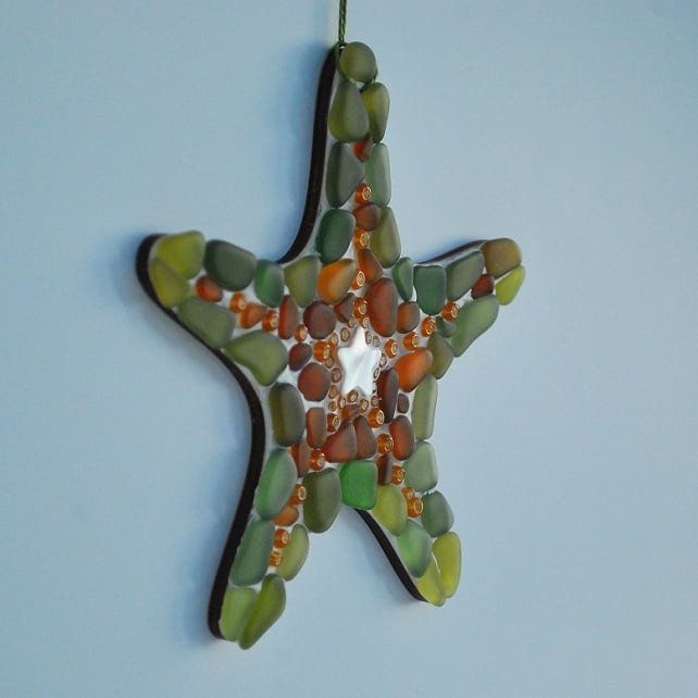 This gorgeous wall hanger has been made from pieces of beach glass, glass beads and a mother of pearl star. The glass is a lovely range of shades of olive green and brown, and we have tumbled it so it is rounded and smooth. The back of the hanger is top quality plywood, cut by laser so it has a nice brown edge.