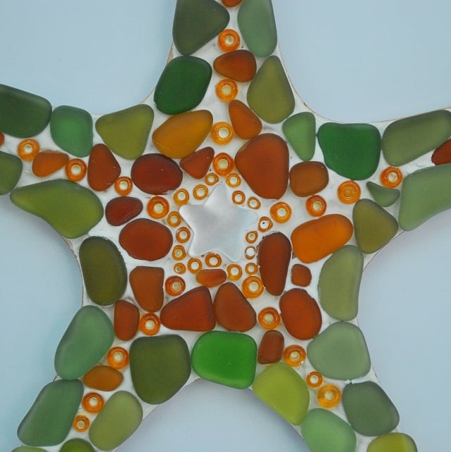 Our mosaic wall hangers are made in Chudleigh, Devon, using materials we collect ourselves from local beaches. Each piece of glass is unique, so each wall hanger is unique. Because our raw materials have spent time on the seashore our products may have small imperfections, which we think is part of their charm. We only use materials which have rounded edges, which is why we tumble pieces which have rough edges (this continues the process begun by the waves) until they are smooth.