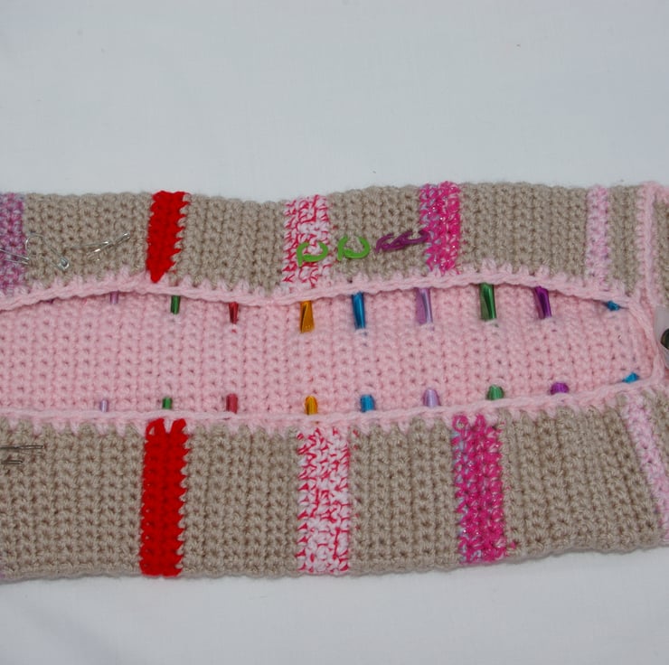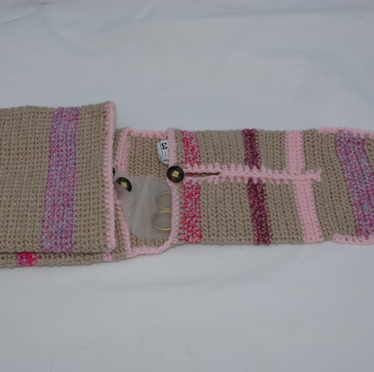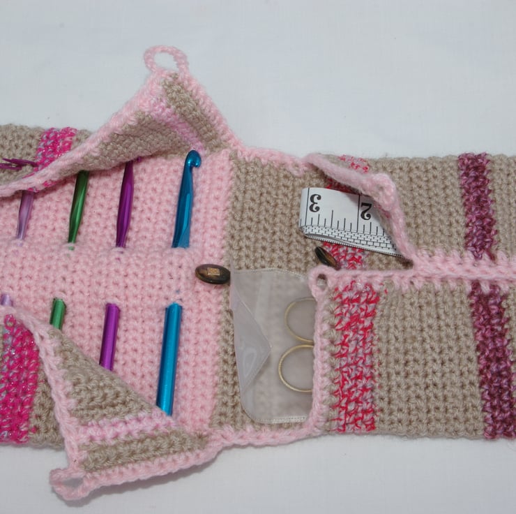 One Crochet Hook Tidy hand crocheted in a fawn colour with a variety of pink stripes. The case folds and fastens with two large wooden buttons.