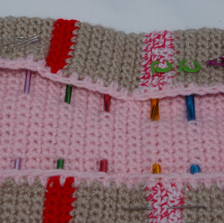 Once opened and unfurled the tidy reveals two separate compartments. The first two contain a tape measure and a pair of scissors. The main compartment contains a large pink crochet piece into which 12 crochet hooks are held.