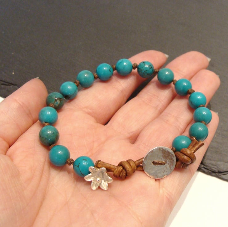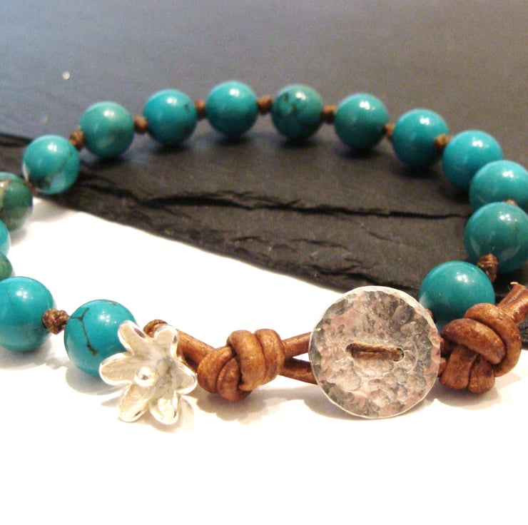 Smooth turquoise rounds hand knotted onto a brown leather clasp. Closes with a handmade sterling silver hammered button and Karen Hilltribe silver flower charm.