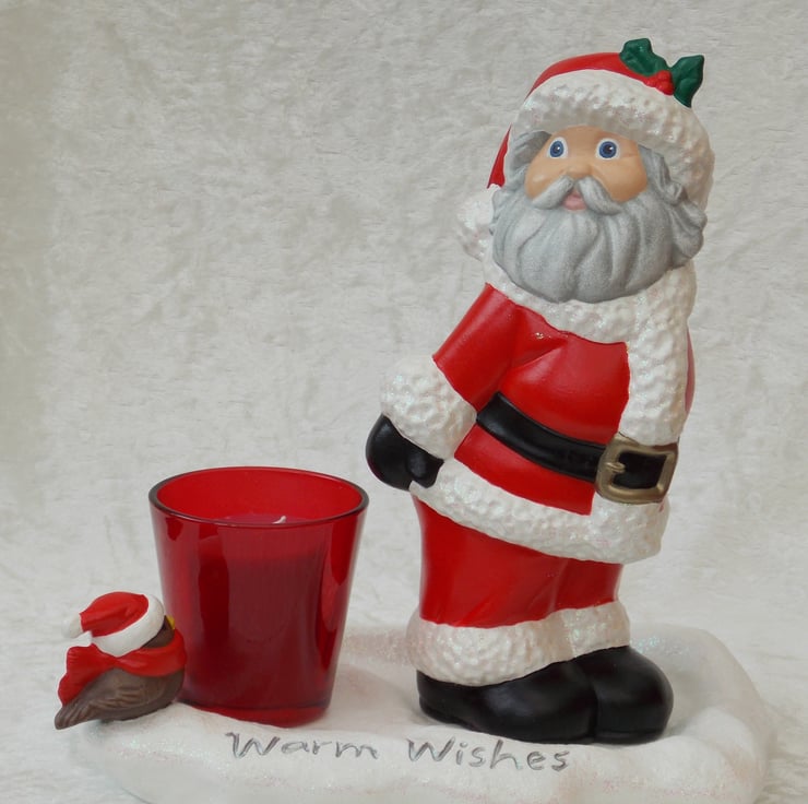 I have for sale a ceramic Christmas decoration, which was hand painted by myself. It is a white snowy base, with a small robin sitting on it and the words 'Warm Wishes', written in silver coloured lettering. Also, but separate, a Father Christmas ornament and a red glass candle holder, with a red candle inside. The Father Christmas is standing and looks like he is warming himself on the candle. This would make a lovely addition to anyone's Christmas decorations, or perhaps given as a gift.