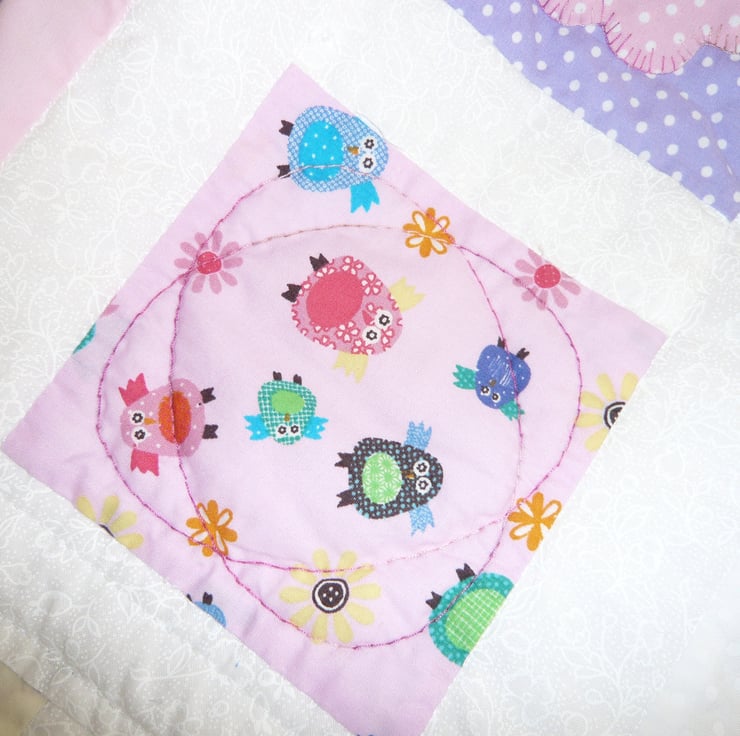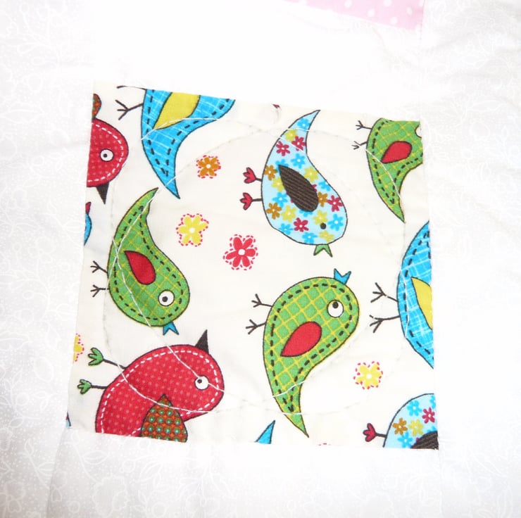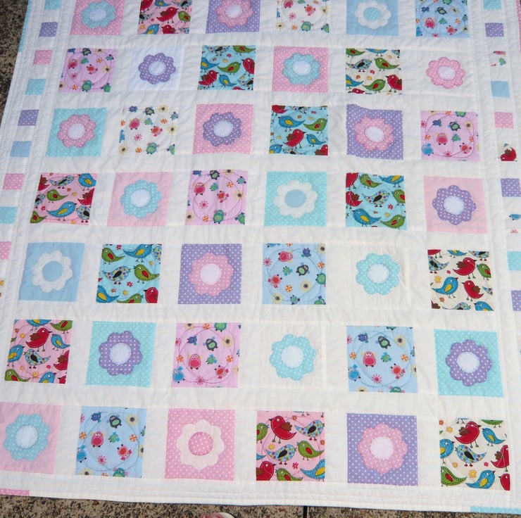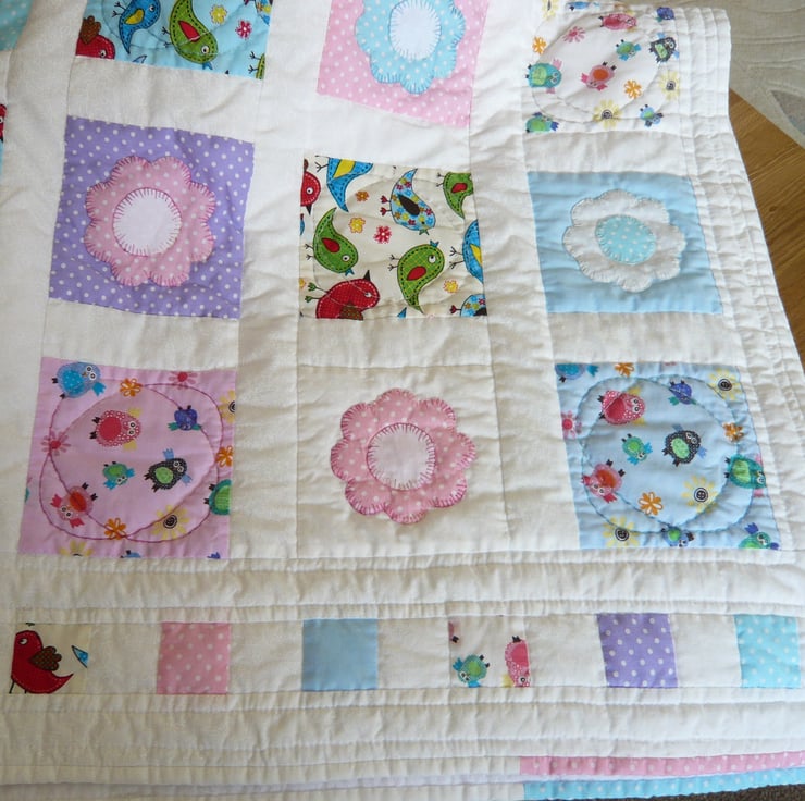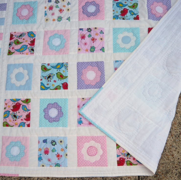 This is a lovely little quilt ,made in beautiful summer colours, it has alternate squares of birds and a hand appliqued flower.with white sashing. The back is white brushed cotton that is so lovely and soft.