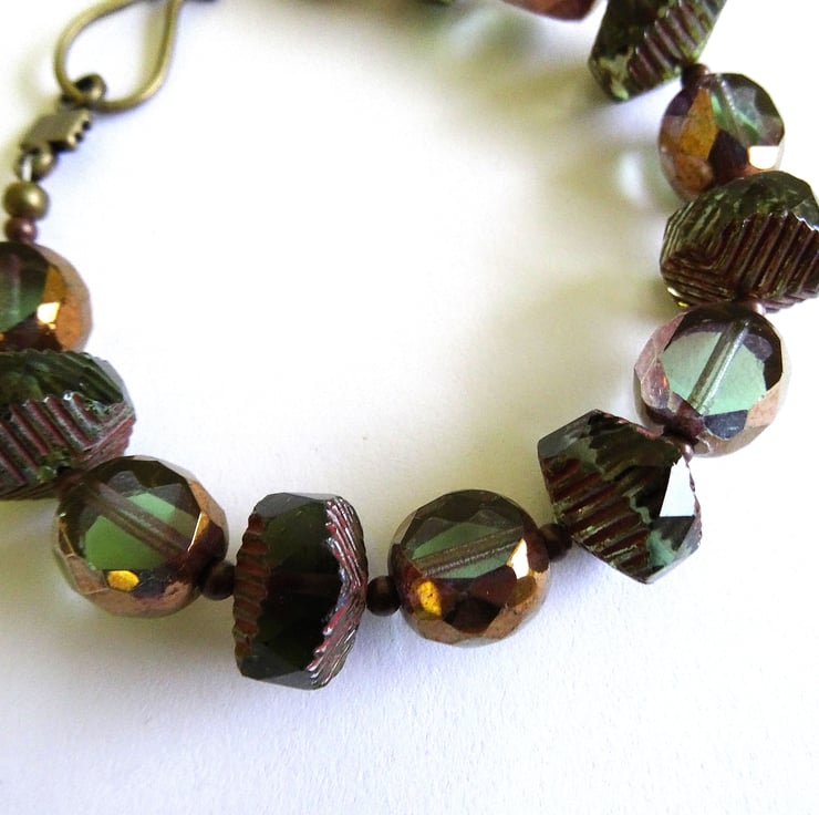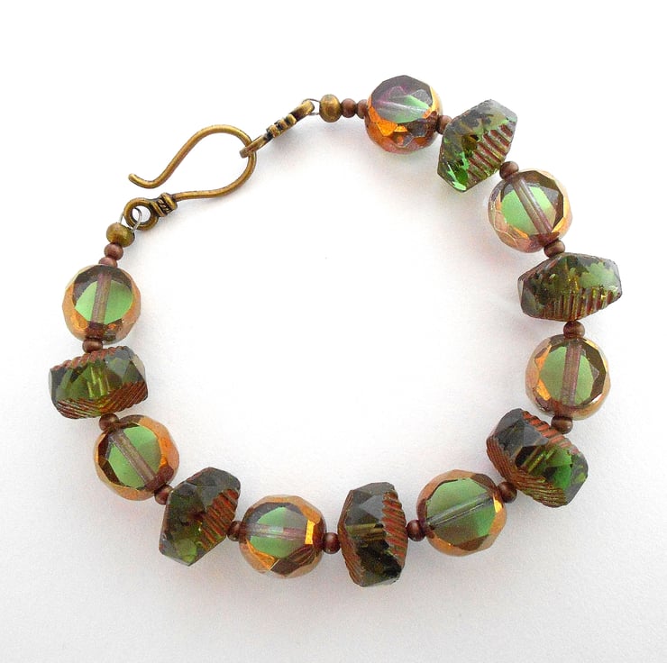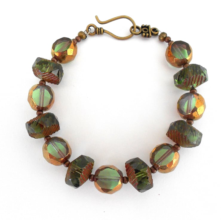 This is a gorgeous bracelet made from top quality unusual czech glass beads. There are large 14mm rondel style beads which are faceted and have a ribbed edge. Also 12mm table cut green glass beads with a bronze coating around the edge - these beads are just lovely. The bracelet measures just over 20cm and is finished with a antique bronze hook clasp. As all of the items in my shop are individual pieces made by myself, this is the bracelet you will receive. It will arrive gift wrapped in tissue paper and a organza bag.