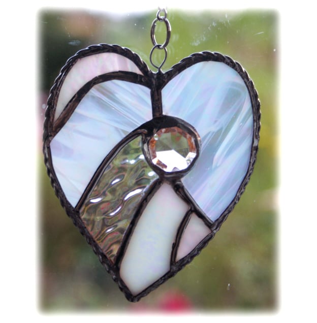 This is a very shiny heart, made entirely from iridescent glass, streaky, opaque, textured, clear, pearl coloured. To give it extra shine and sparkle power I've added a big multifaceted crystal.