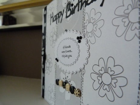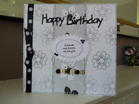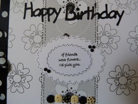 Quality white card which has been covered with three strips of co-ordinating black, grey and white flower patterned papers which have had hand drawn stitches in black ink all the way round. Two oval toppers with scalloped edges are in the centre with 'if friends were flowers I'd pick you' stamped in black ink. Embellished with black rhinestones, a row of six black, cream and spotted buttons and finished off with a black and white spotted ribbon and bow.