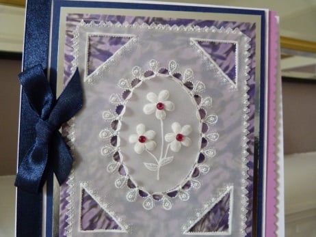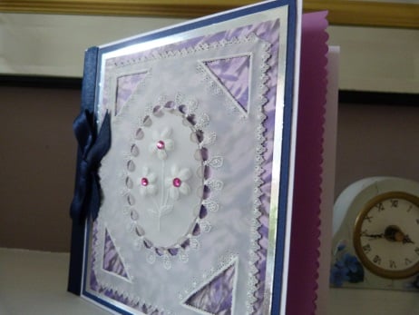 A pretty design cut, embossed and pierced from parchment consisting of a central oval which has had the scalloped edging cut out so that a separate oval of parchment which has a pretty sprig with three daisy flowers. The corners cut out into triangles. The flowers have bright pink rhinestone centres. The parchment has been mounted onto blue/lilac patterned vellum and this shows through the triangles and scallops. The edges of the parchment have been cut into an intricate triangle design. All mounted onto silver mirri card, then dark blue card and then onto quality white hammered card. Finished off with navy blue ribbon and bow.