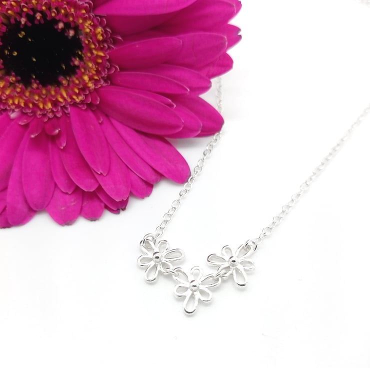 This gorgeous necklace is from the Iris collection and features three Iris shaped links. The necklace links are delicate belcher chain which allows strength whilst maintaining a soft, feminine feel to the jewellery item. The clasp is also sterling silver and an extension chain can be attached if required, please notify us of this via email when placing your order.