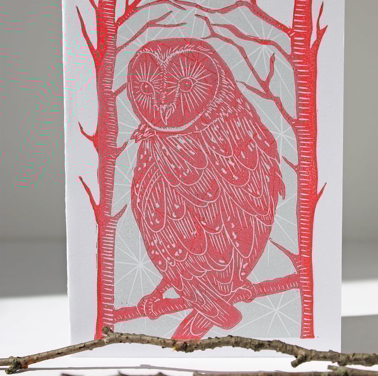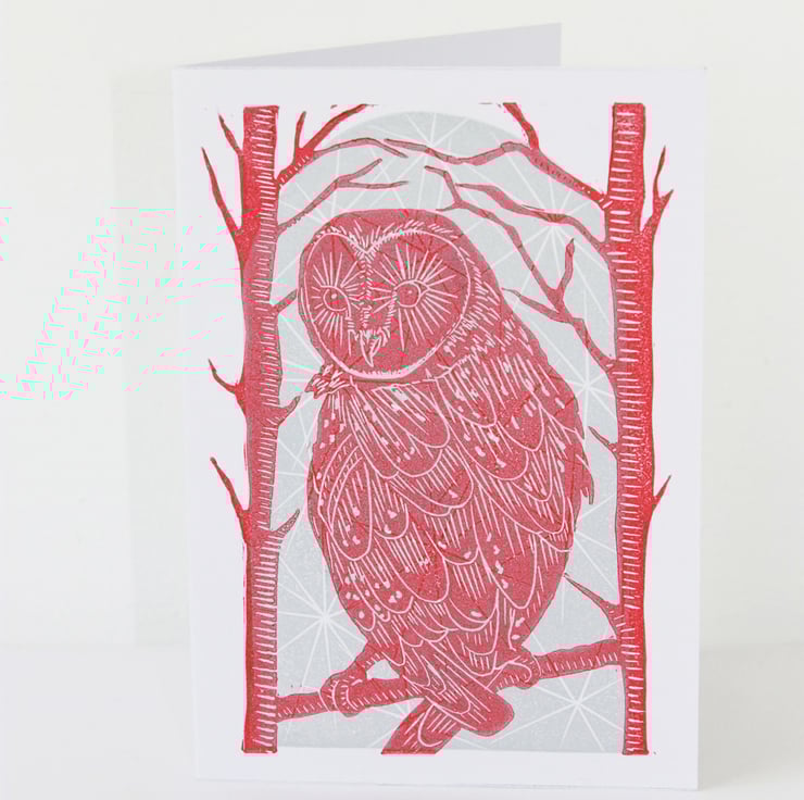 The image is printed in silver grey and transparent red ink on heavyweight white card. Envelope included.