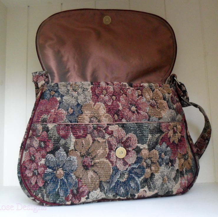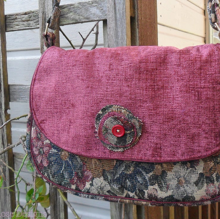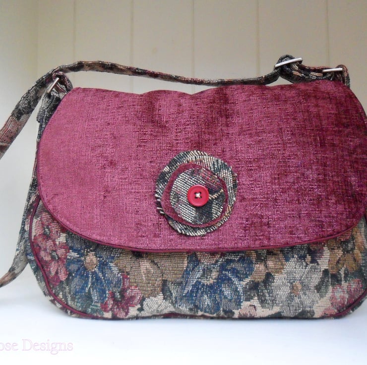 This is a great medium sized handmade shoulder bag in lovely Autumn shades. The main body of the bag is in a lovely textured floral upholstery fabric in muted shades of red, brown, green and beige. The bag edges are all piped in a maroon taffeta and the flap is in a contrasting maroon chenille. There are two slip pockets on the outer front of the bag , allowing quick and easy access to phones, bus passes and other essentials. The lining is a shimmering light brown taffeta and there are two inside pockets, one of which is zipped. The flap closes with a bronze tone magnetic snap and is decorated with a matching handmade brooch - the edges of which have been left unfinished. The bag seams have been double stitched for strength and it is interfaced and interlined for structure and stability. Measurements are 13" x 9" x 1 1/2" (33 x 23 x 4 cm). The adjustable bag strap has a maximum length of 31 1/2" (91 cm) - measured from the top of the bronze handle rings.