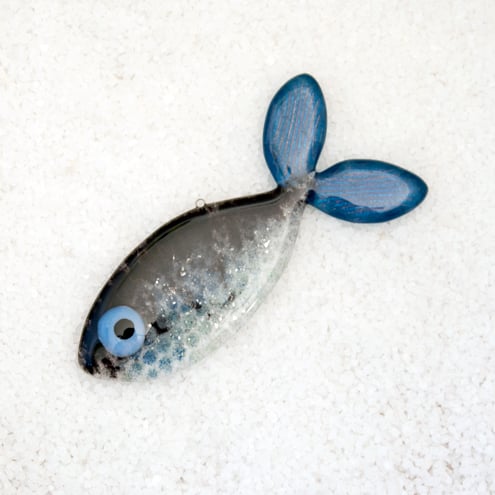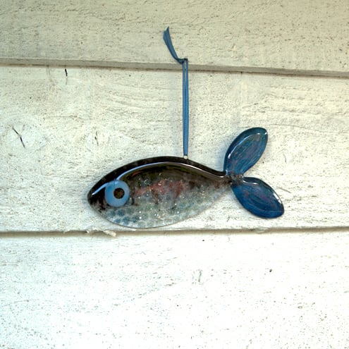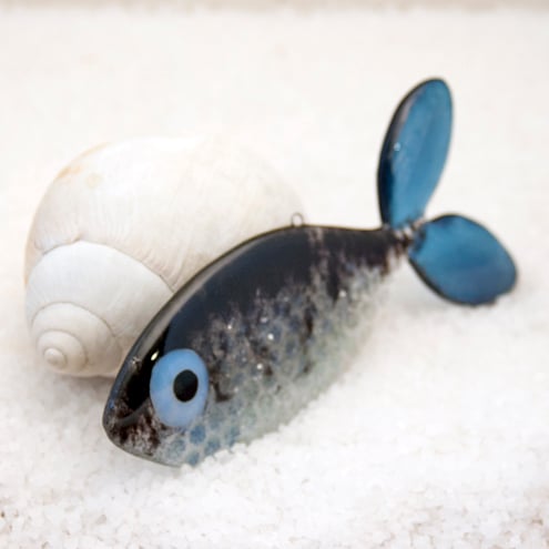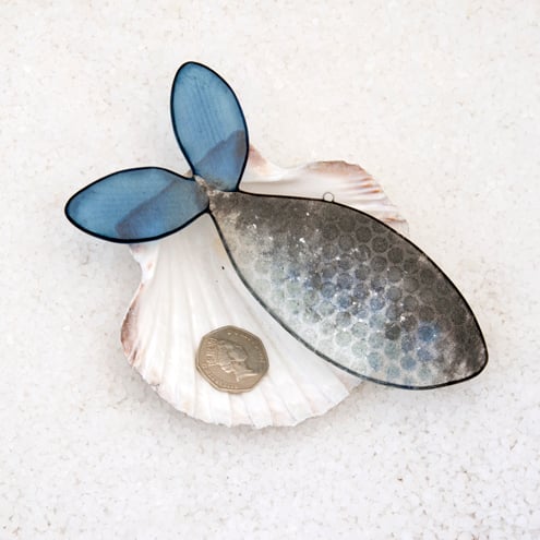 Created from layered blues, black and clear Bullseye sheet and ground glass in my Whitstable workshop. The body, eye and fins are all hand cut and fused separately before being joined in another firing with the hanging wire secured in place. Final adjustments are made to the shape and then the whole piece is fired again. This design has a beautiful scaled effect and silver flecks which capture light beautifully. The pale blue tail has a delicate ribbed effect. A blue satin ribbon is attached to complete the design.