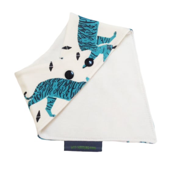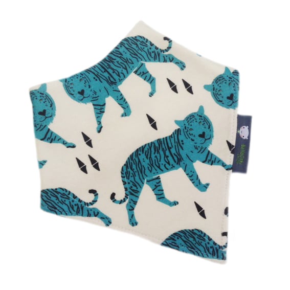 Organic baby Bandana Bib in TIFFANY BLUE TIGERS Organic Jersey Knit fabric to give a modern edge to your babies outfit. Lined in ultra soft & absorbent Organic Bamboo & Cotton fleece fabric, keeping moisture away from their chests whilst keeping their clothes dribble free & looking ultra cute.