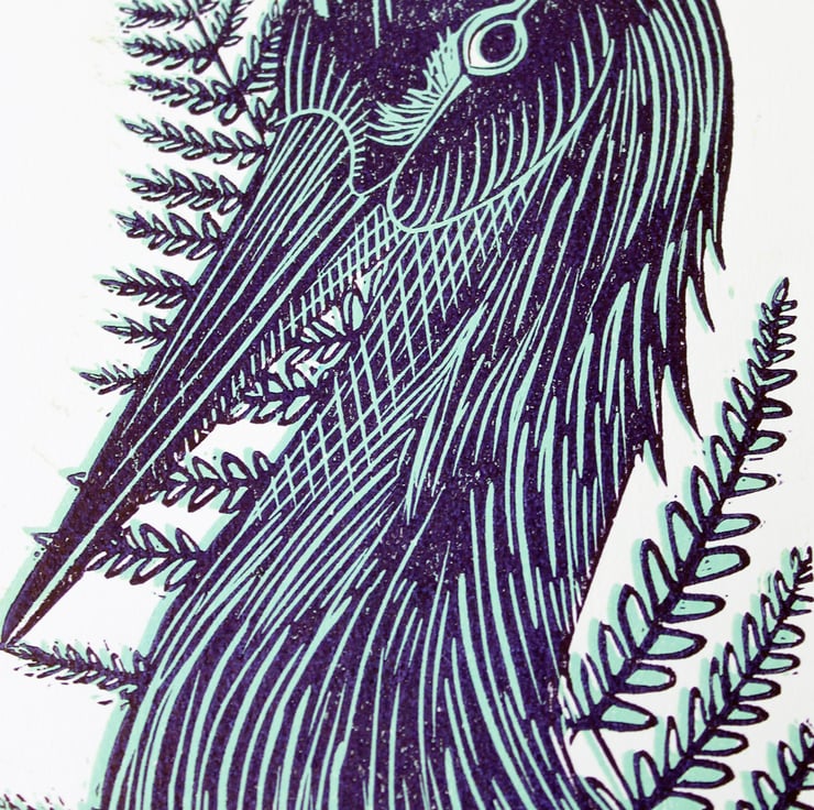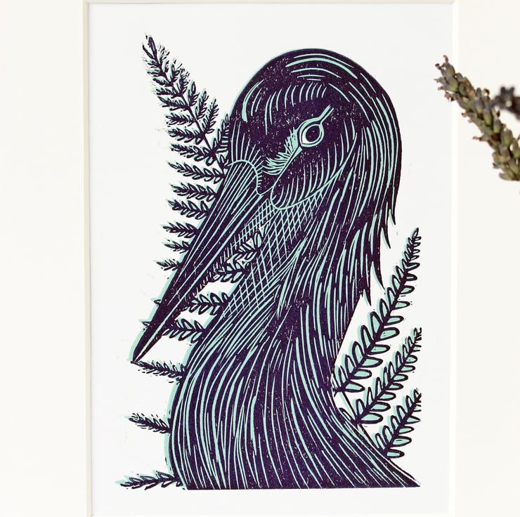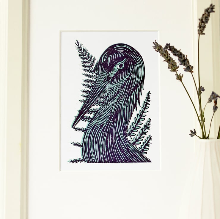 An original two colour handmade Lino print of a Crane and Fern. Limited edition of 5 in this colour. Part of my series of Crane prints, direct from sketchbook drawings.