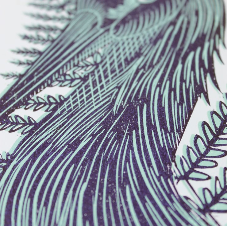 The image is printed in soft blue and dark blue/purple water based ink on 300gsm cartridge paper.