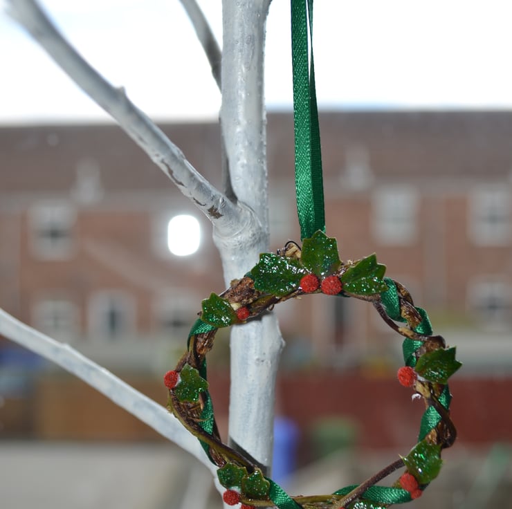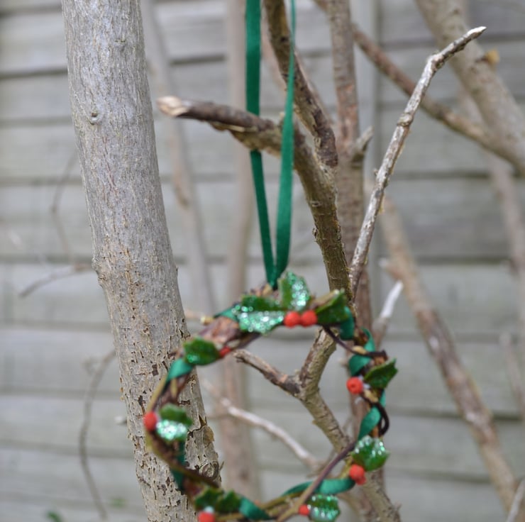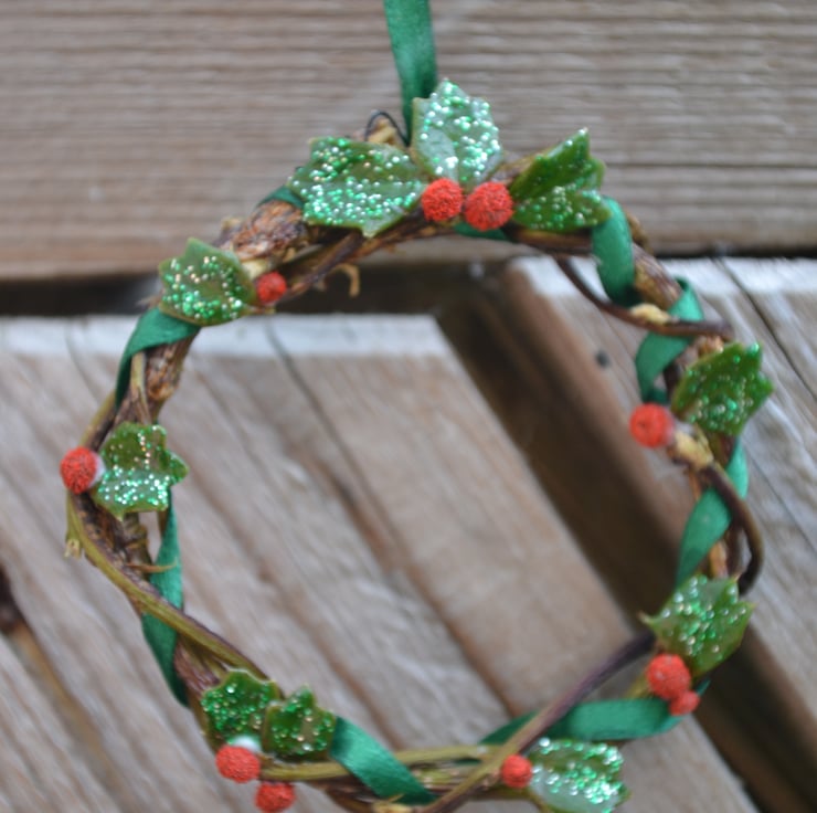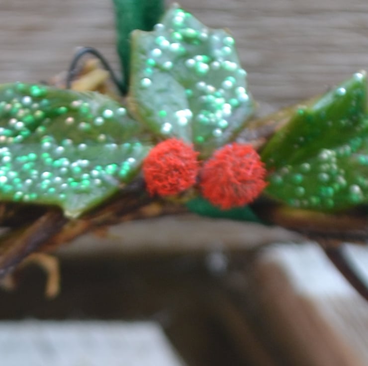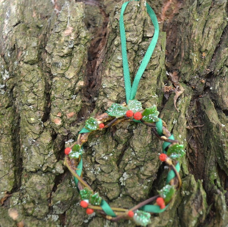 Fairies love all things pretty, and are just as keen to decorate their homes at Christmas time. With that in mind, what better to get the fairies in to the spirit of Christmas than this unique and gorgeous traditionally styled mini Christmas wreath. The wreath, which has a 6cm diametre, is a circle of intertwined twigs decorated with mini mistletoe leaves and berries suspended from a bright green ribbon. The wreath including the ribbon hangs 12.5 cm in length.