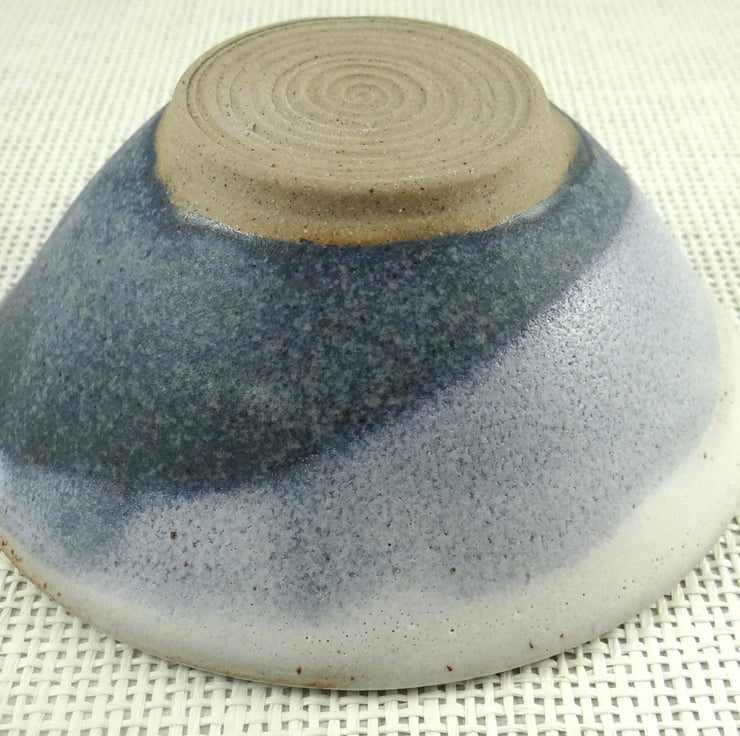 Glazed in shades of white and blue reminiscent of sea, sand and sky. The strong stoneware clay has a high iron content which produces burnt orange shading especially to the outside. Slight unevenness of glaze and/or form is evidence that the bowl is handmade and adds to its rustic charm.
