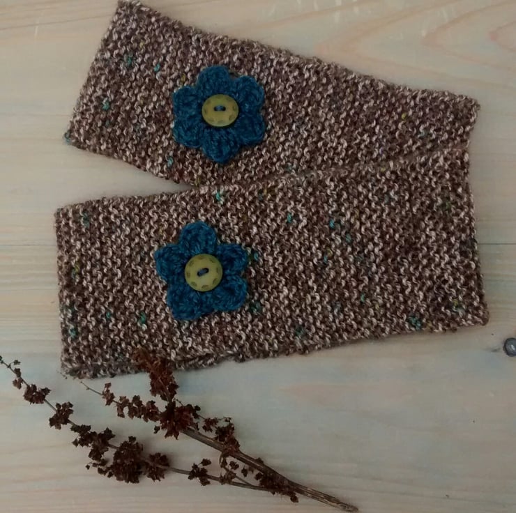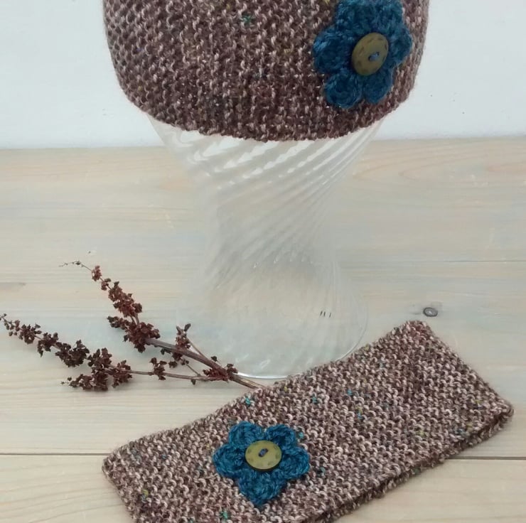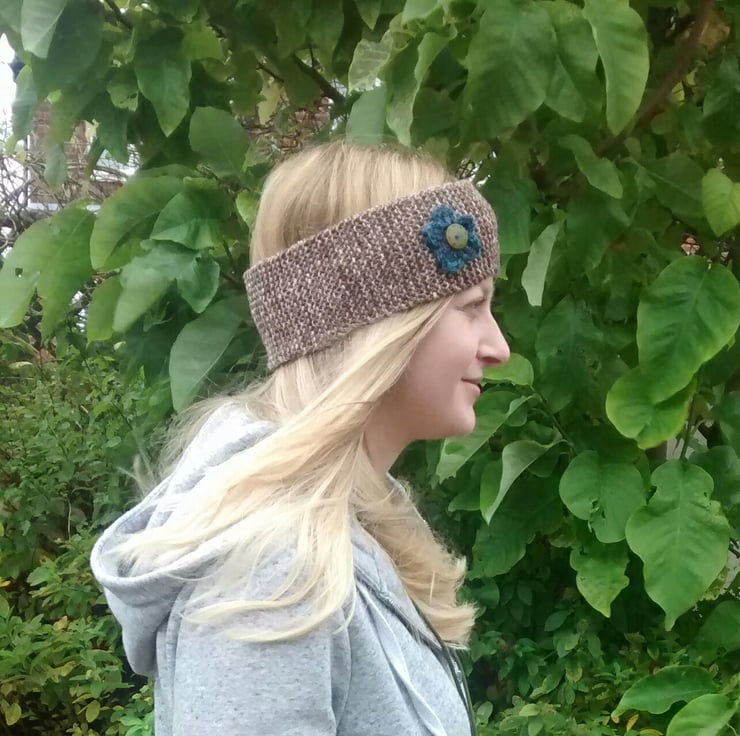 Cosy knitted headband in a beautiful brown tweed acrylic wool blend with a crochet flower decoration. Hand made to my own design this headband will add colour and style to any outfit.