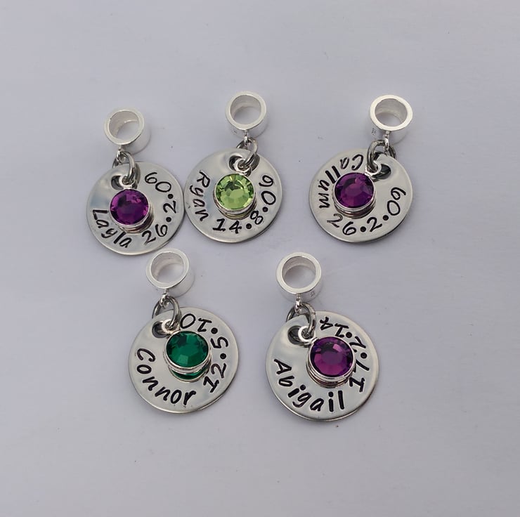 In the notes to seller during checkout please include the shape of charm you would like (circle or heart), the text to be stamped on each charm, and which crystal you would like.