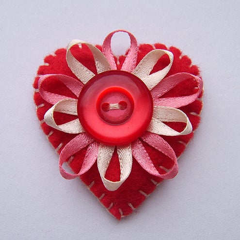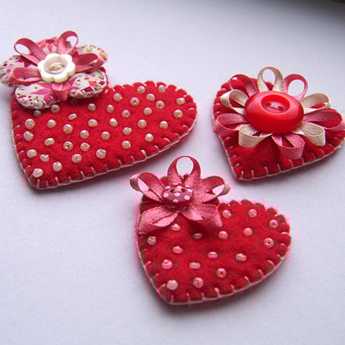 The largest has a pretty applique flower detail with ribbon and button centre and is finished with cream beading. The middle size has a pretty ribbon flower with button centre and the smallest heart features a ribbon flower and beading detail.