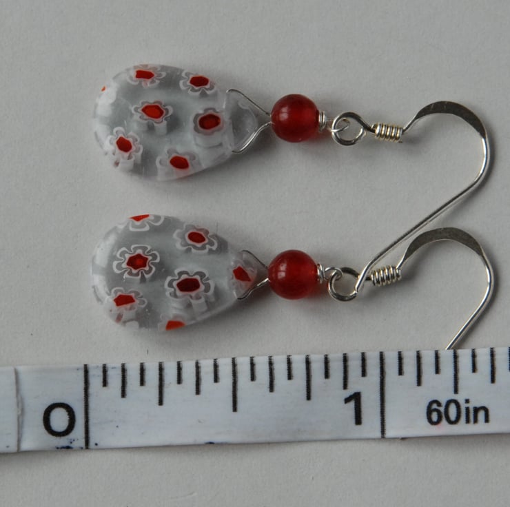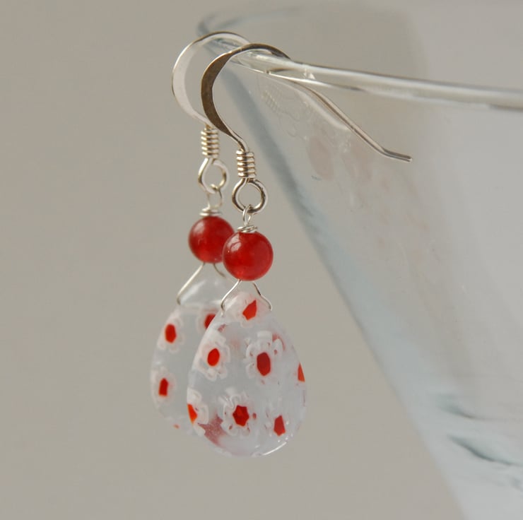 The focus of these earrings is a drop bead of clear glass surrounding little flowers, white with red centers, millefiore beads. Mounted on silver wire and topped with a red quartzite bead these are perfect for summer - bright and cheerful. They are finished with sterling silver hooks.