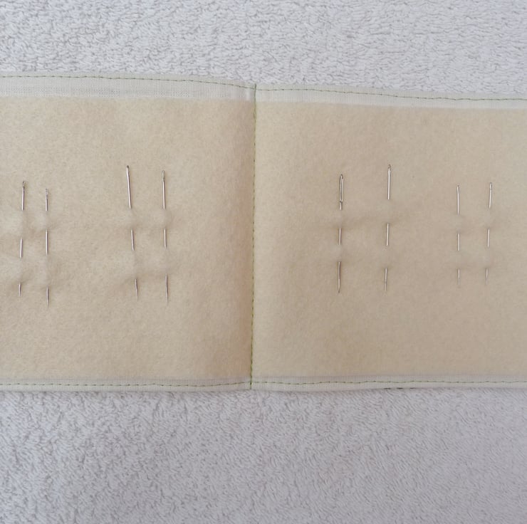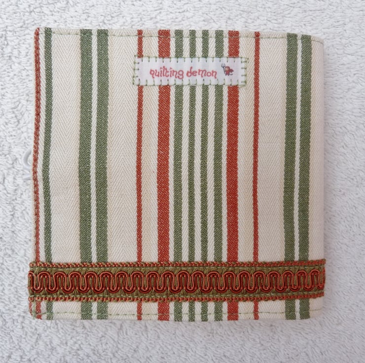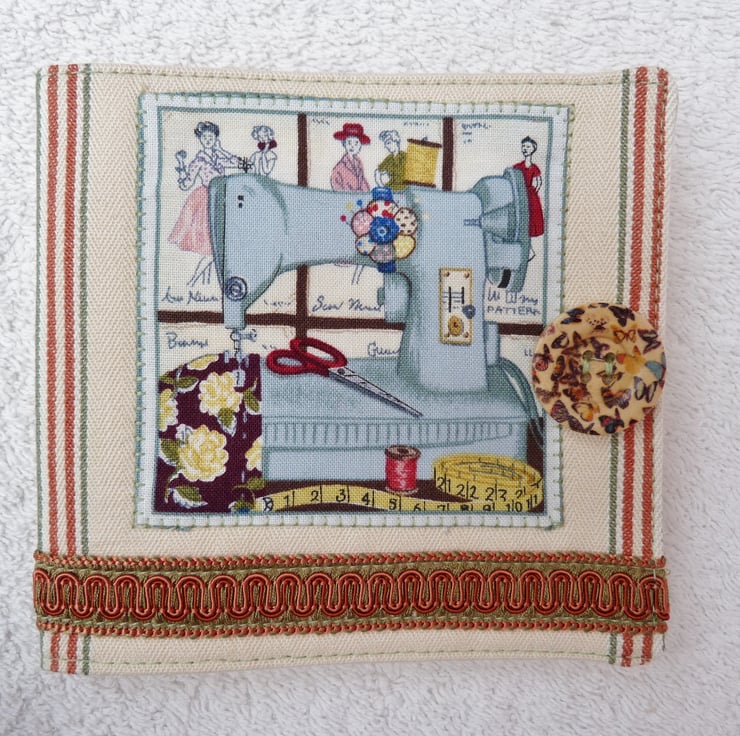 I have created this lovely sewing needle case from a striped upholstery weight print cotton.It has an applique decorative panel and embellished with braid. The needle case is lined in a plain cream cotton fabric, has interfacing for structure and has a felt insert to keep your needles safe. The case has a printed wooden button and elastic to close, and is top stitched for a professional finish. The needles shown in the picture are included.
