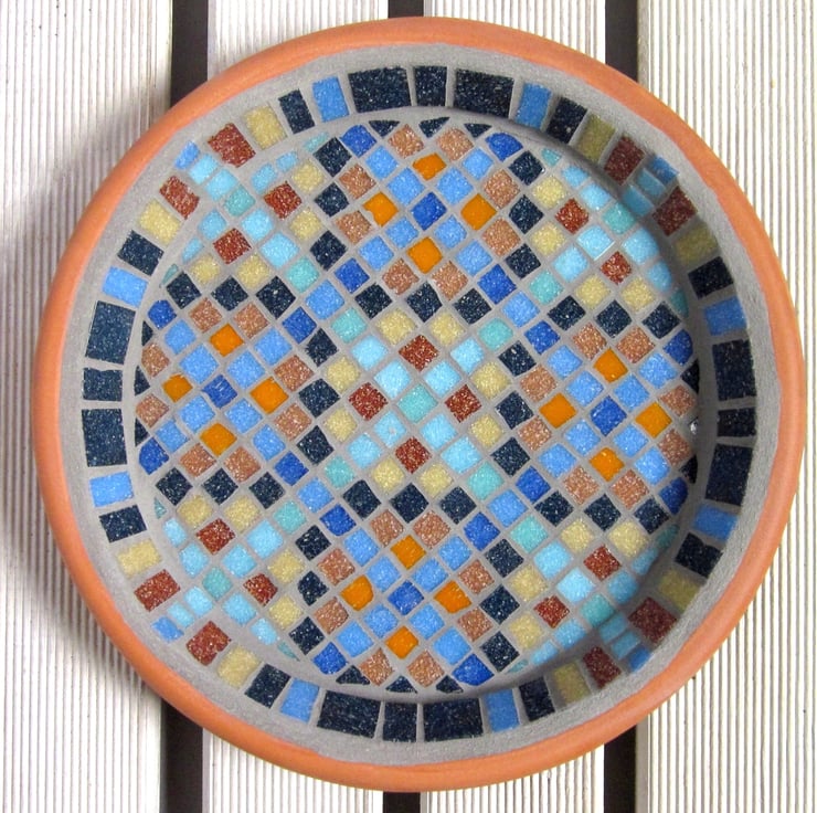 A 25cm diameter terracotta saucer with a mosaic made out of vitreous glass tiles. The mosaic is finished with a cement grey grout that is designed to repel algae and mold.