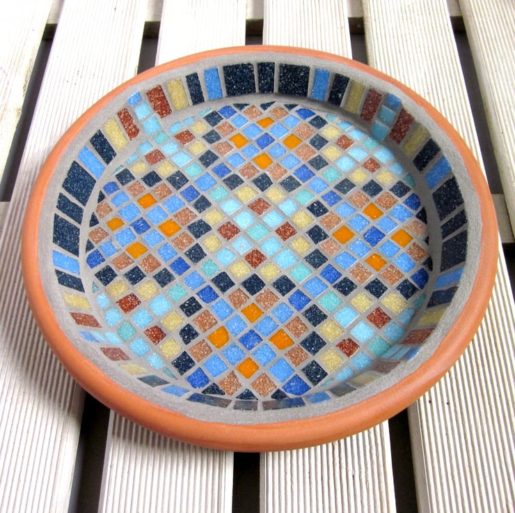 A 25cm diameter terracotta saucer with a mosaic made out of vitreous glass tiles. The mosaic is finished with a cement grey grout that is designed to repel algae and mold.