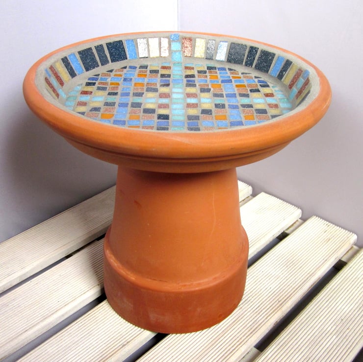 Using the colours of Moroccan tiles, and with it's geometric mosaic pattern, this bird bath will add a touch of the exotic to a garden border, deck, or patio. Great as a splash of colour, and great for birds to bathe in and other wildlife to drink from too.