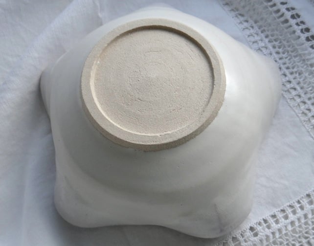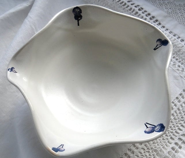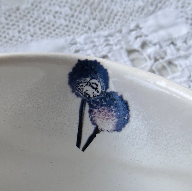 I enjoy throwing on the wheel as it gives me great control over the forms I produce. I like the shape of this bowl with the scalloped rim accentuated by a hint of pink to the cream glaze. The images are created from a plant that grows on the Atlantic coast near Mendocino CA. Fired into the finished piece at 850 degrees C, they have fused into the glaze and will not mark or fade in any way.