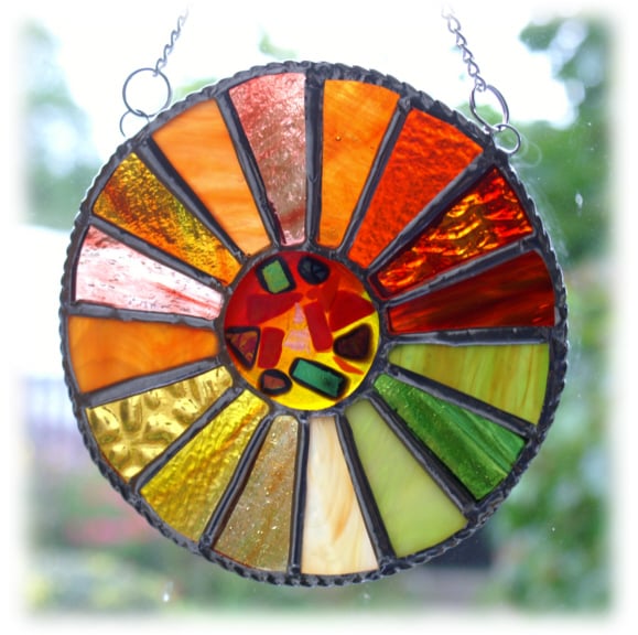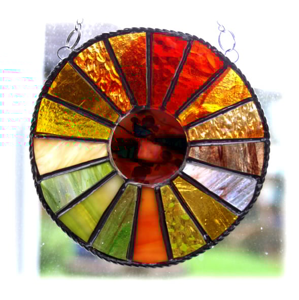 This is a stained glass suncatcher made using the Tiffany copper foil technique.