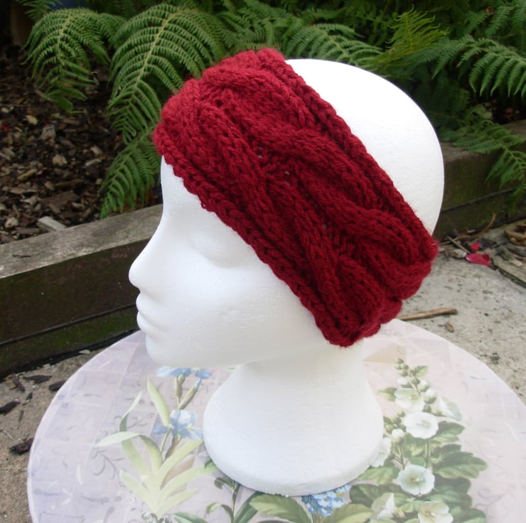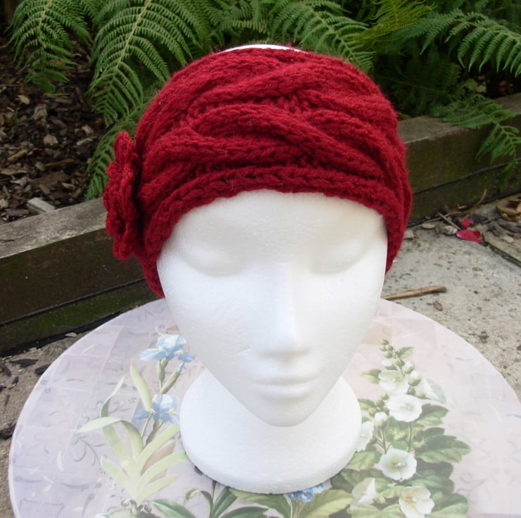 I've knitted this adults ski band in a chunky dark red acrylic yarn. It's knitted in a cable pattern and finished with a double layer crochet flower.