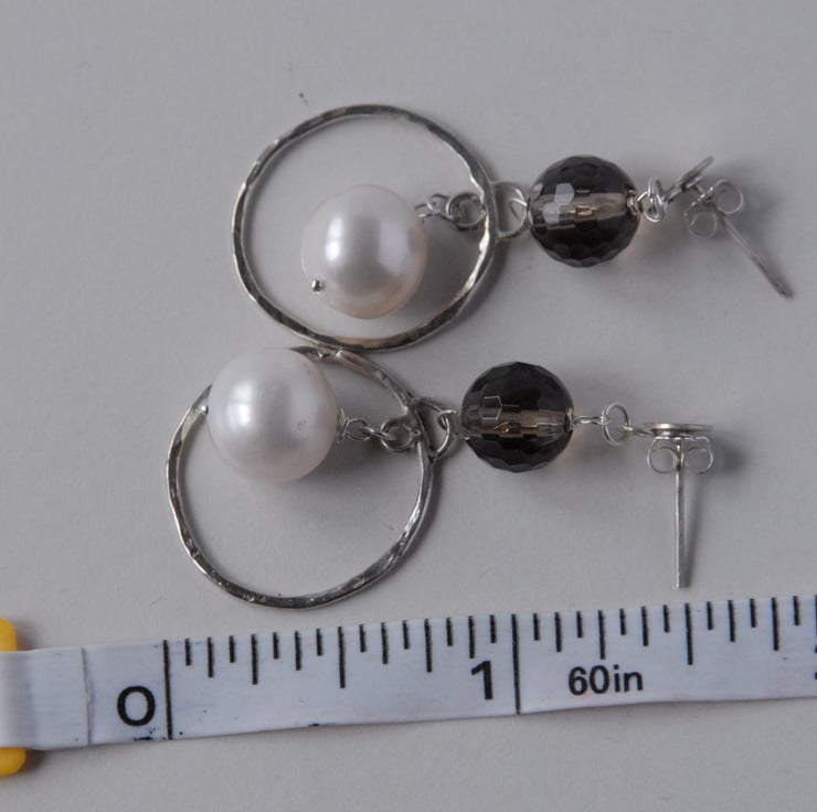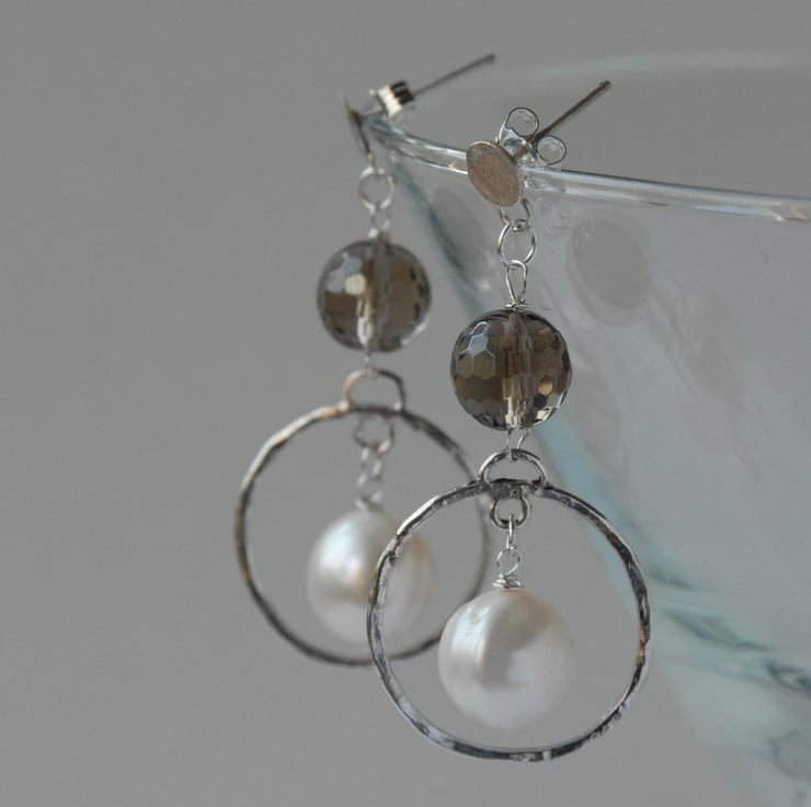 In these bold, statement earrings creamy white round cultured pearls (approx 9mm round) hang within textured silver frames beneath faceted smoky quartz rounds which all hang from a textured round silver stud. These earrings are large without being too heavy and make a statement without being garish.