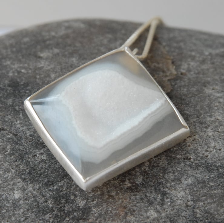 In this pendant a diamond of white druzy has been bezel set in an open backed matt sterling silver setting. Druzy is where crystal points still exist on the surface of the stone (like the inside of a geode) so it sparkles slightly as the light catches it, the matrix around the druzy (in this case quartz) is semi clear so picks up your skin tone or clothing making the white druzy stand out more.