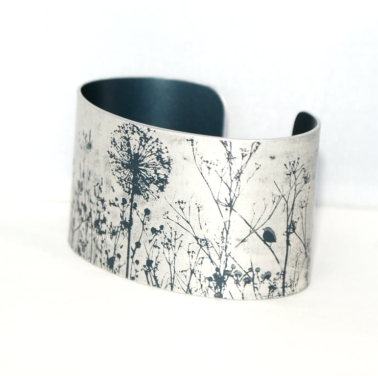 A hand dyed aluminium cuff with a hedgerow along the bottom. The design originates from my own photographs which I layer and edit in Illustrator until I have a black and white image. This is then used as a resist when dyeing the cuff and leaves the design in the silver colour of the metal. Please note your cuff may vary very slightly from the image.