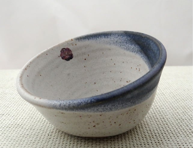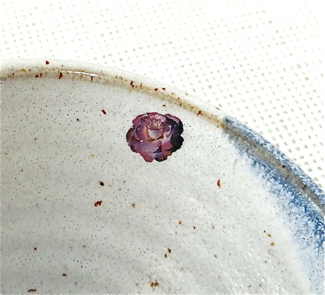 A cute slanted bowl made in my studio and finished off with a little image of a rose I photographed during the summer. Made of stoneware clay and coated with my own glazes, the bowl is strong and the rose will not wear off.