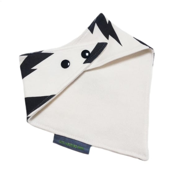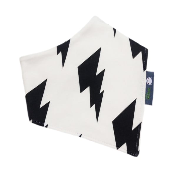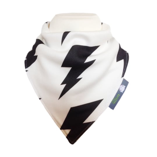 Organic, baby bandana bib in LIGHTENING BOLTS Organic knit jersey fabric to give a modern edge to your babies outfit. Lined in ultra soft & absorbent Organic Bamboo & Cotton fleece fabric, keeping moisture away from their chests whilst keeping their clothes dribble free & looking Ultra Cute.