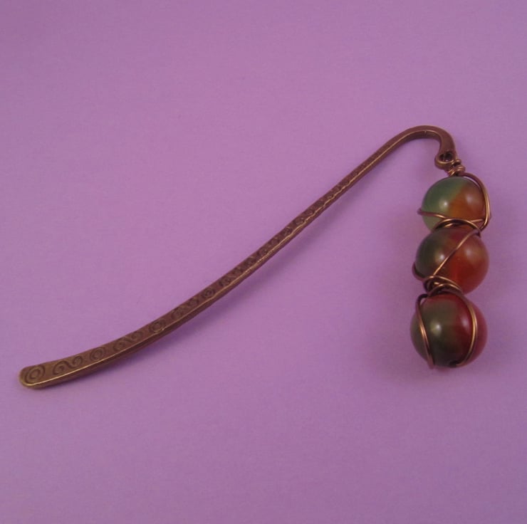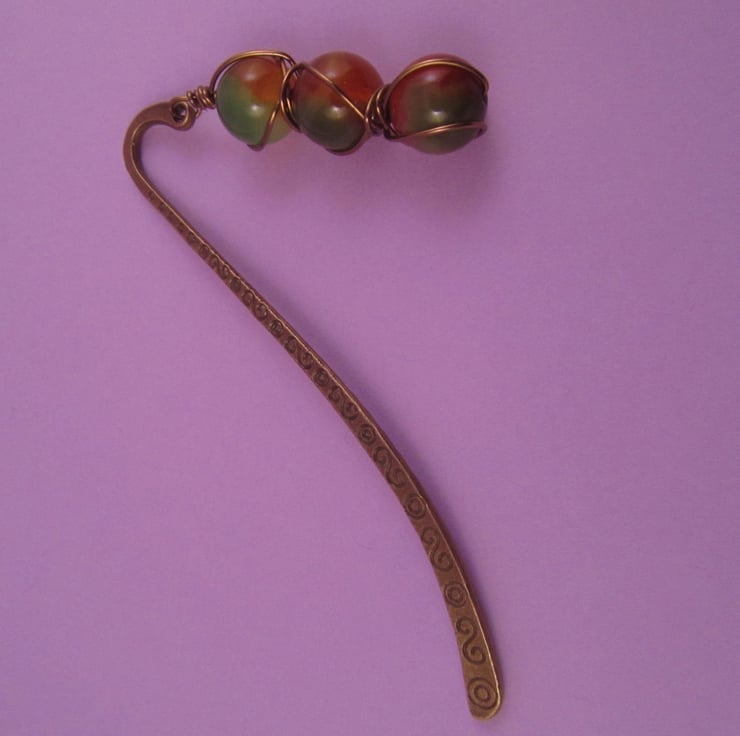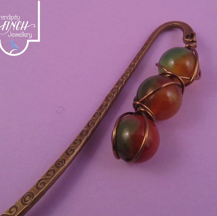 This is a beautiful Green orange agate wire wrapped bookmark. It is created using real agate gemstones, silver plated antique bronze colour copper wire, and a metal bookmark finding. It adds a bit of fun to reading, and would be the ideal present for a book lover.