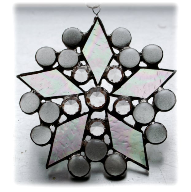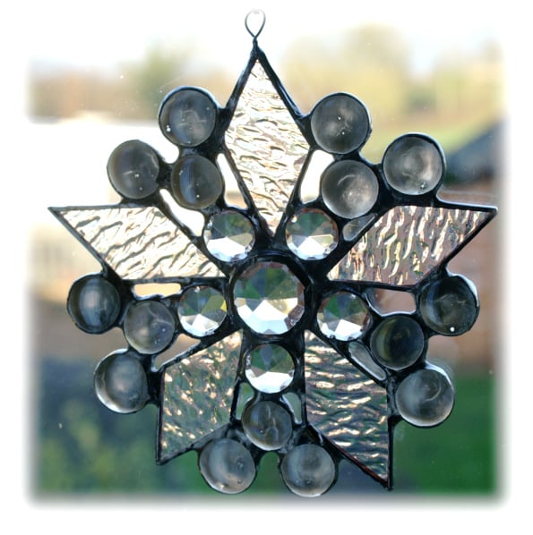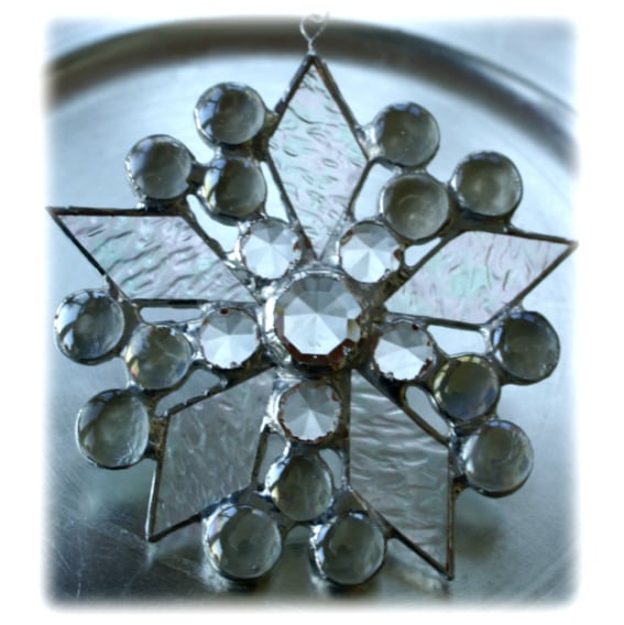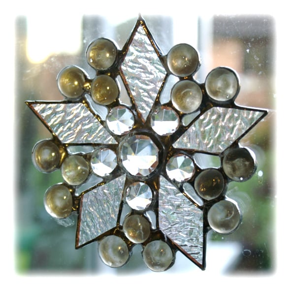 I've designed it with 5 diamonds made from prettily textured iridescent clear glass and with a central faceted and very sparkly chandelier crystal,.