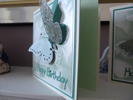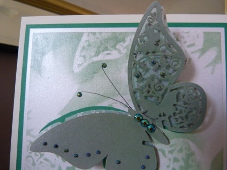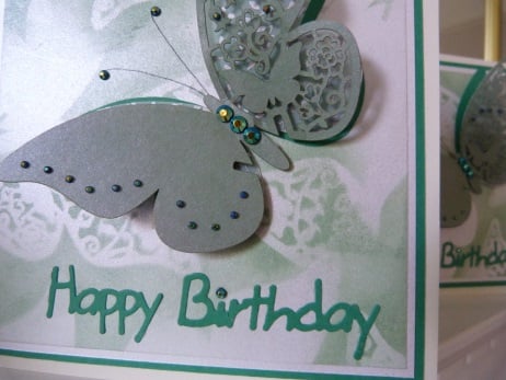 A beautiful die cut butterfly which has been coloured pale green , another layer of flower printed vellum and then an emerald green bottom layer cut from card forming a three layered butterfly. This has been mounted onto white card which has had an image of a butterfly stencilled with green ink. This has been mounted onto ivory pearl card, then onto emerald green card and then onto quality cream card. The butterfly has been embellished with beautiful blue/green rhinestones. A Happy birthday finished this pretty card which has been die cut from emerald card.
