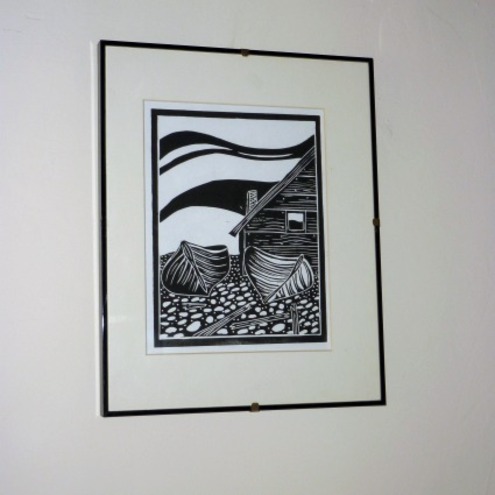 An original lino cut print (open edition). Printed from a hand-cut lino "plate" with an oil-based but water washable ink on to high quality paper. Print size approximately 15.5x20cm and mounted in plain white to fit a 10x12 inch frame (FRAME NOT INCLUDED). These items are hand-printed and so vary slightly depending on ink density, character of the paper, pressure of the press and the way the wind blows (ok, maybe not the last bit).