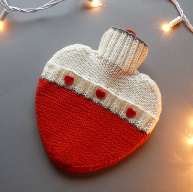 Hand knitted cover with a Scandi inspired snowflake. Heart shaped hot water bottle with heart shaped buttons at the back.