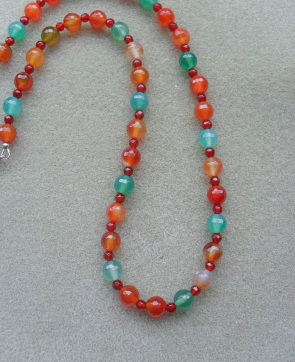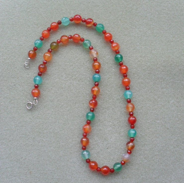 Green and orange/red agate faceted beads approx. 8 mm and 4 mm red agate beads are attached to a sterling silver bolt ring clasp