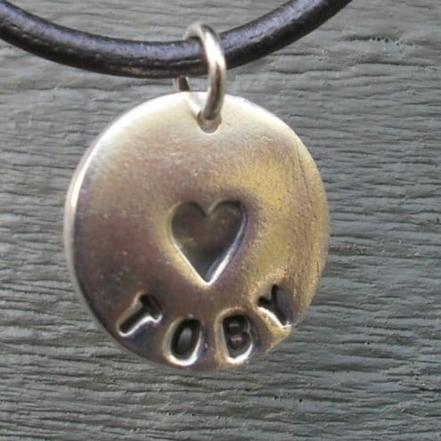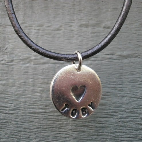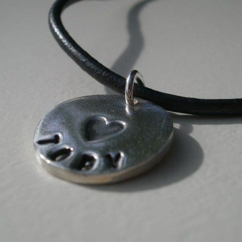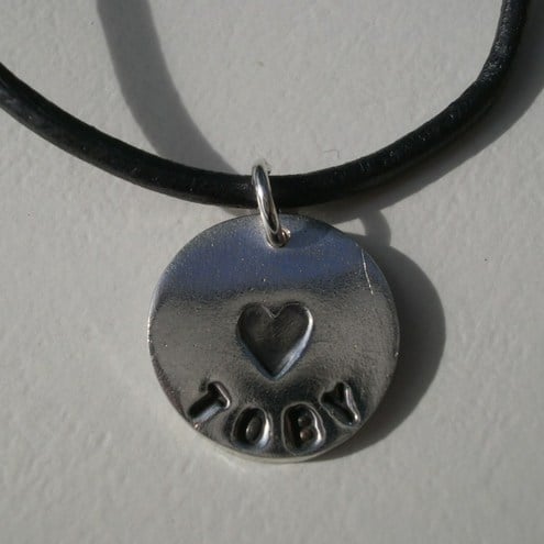 A sweet personalised fine silver pendant, stamped with the name of your choice (up to 9 letters) and a heart in the centre of the pendant. The letters and heart are antiqued so they stand out.