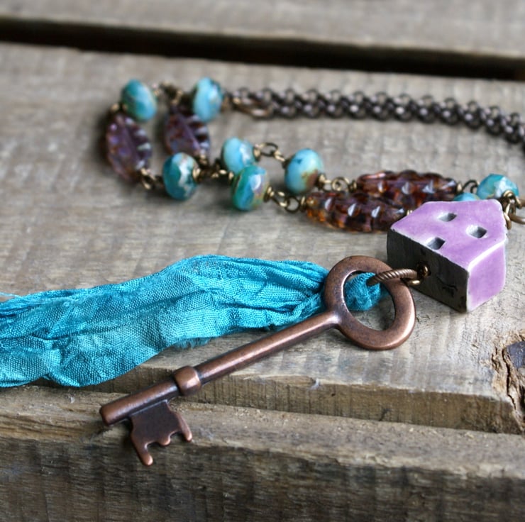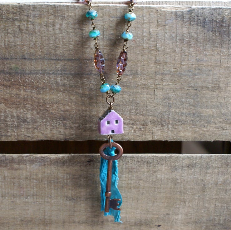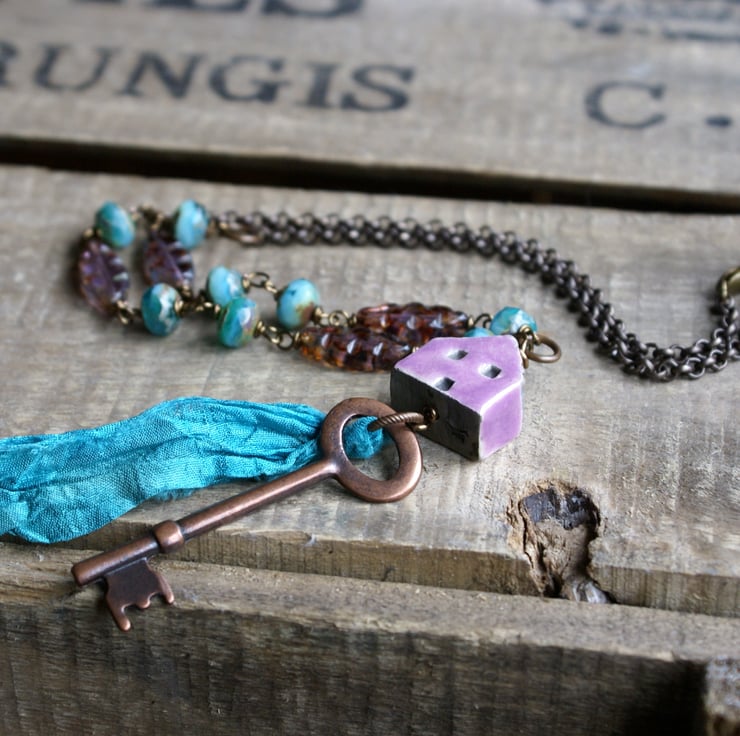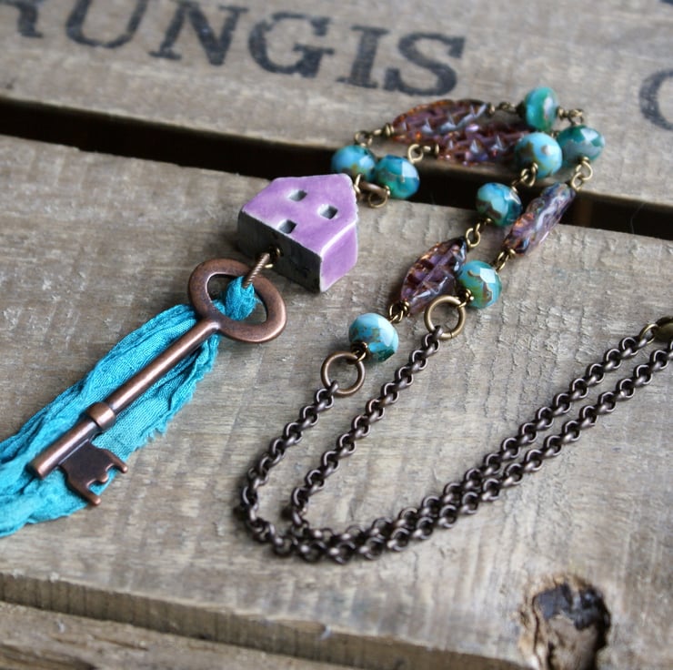 This whimsical necklace features a hand formed pink ceramic miniature house bead, made by Elukka in Finland. Below the house I have dangled a rustic antique copper coloured key and vibrant turquoise recycled sari silk.