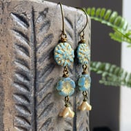 The chain is made up of warm brown Vintaj brass rollo chain, and wire wrapped Czech glass rondelles and spindles in matching shades of pink and aqua.