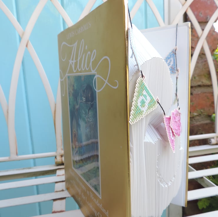 A unique gift! Cheshire Cat book Sculpture. Book stands approx 10" high.This is a fantastic 100 year anniversary Alice in Wonderland book with a handsewn set of "Eat Me" bunting. Books can be made to order . Most names , dates of birth can be done. Allow 1 month for pre orders.