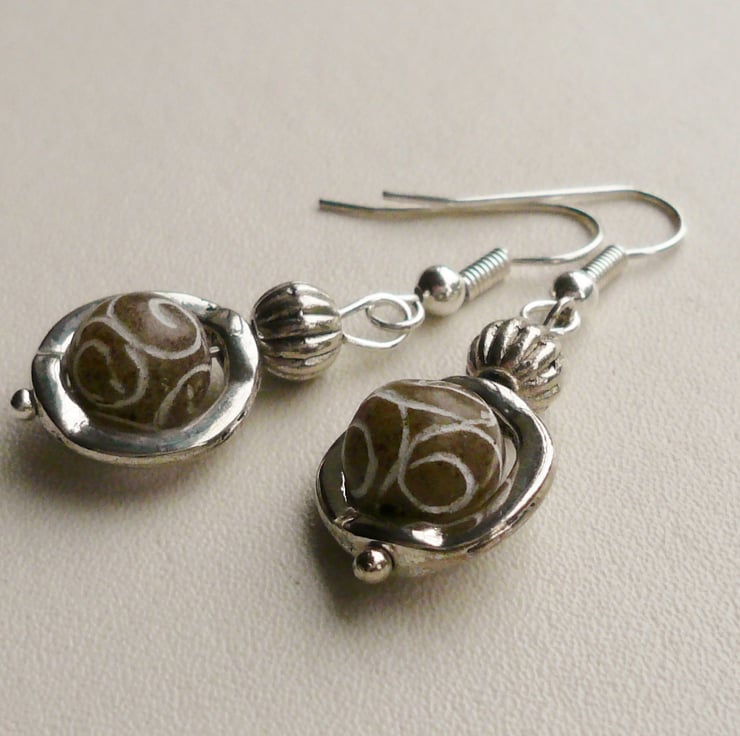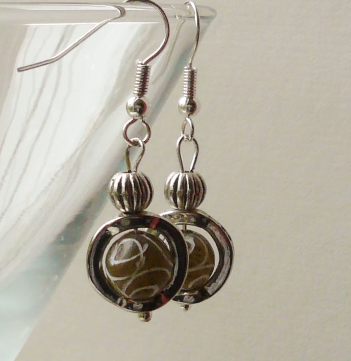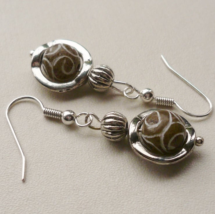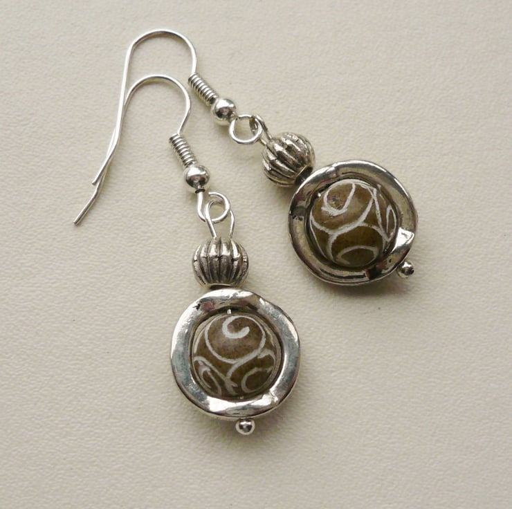 These earrings are made up of 8mm round nutty brown coloured carved Jade beads set inside 10mm Tibetan silver round bead frames. Also includes Tibetan silver 6mm round ribbed beads and are hung from silver plated ear hooks.